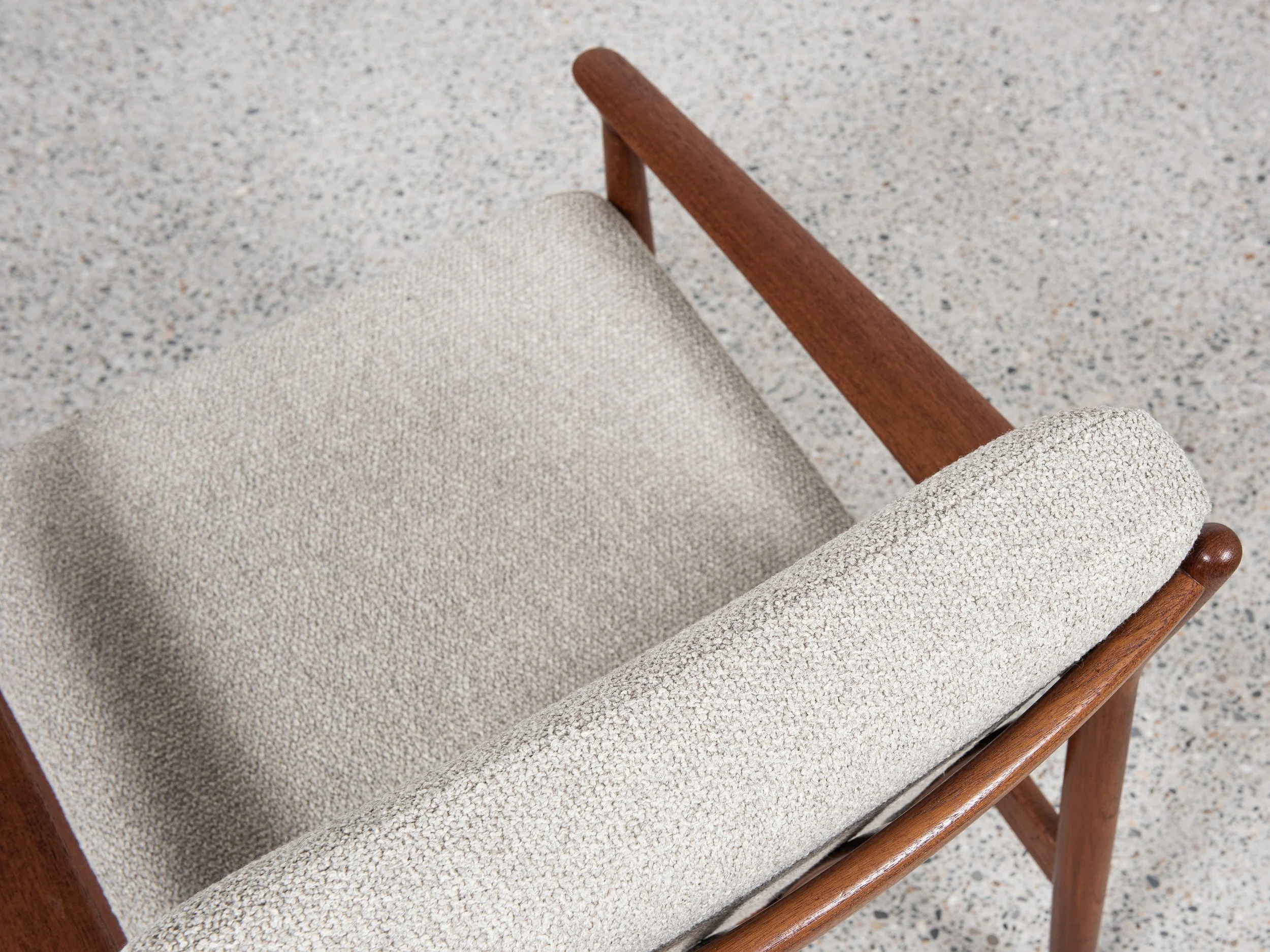 This easy chair is designed by Svend Aage Eriksen and manufactured by Glostrup in Denmark in the 1960s. There is a label by the manufacturer. The design of the backrest and armrests is very refined. The visible black metal connectors are a typical design feature. The connections between solid wooden parts at the front of the armrests are very beautiful. The frames are in solid teak. We have reupholstered the chair with new high quality cushions in cold foam and a beautiful good quality beige fabric with plenty of texture by De Ploeg. The supports under the seating cushions are original and good to use. This easy chair is in very good condition due to our own workshop with over 35 years of experience with wood treatments.